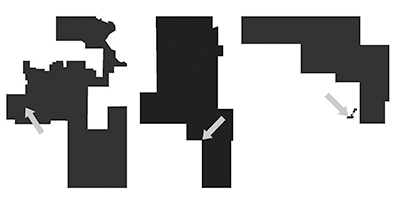The massively irregular shapes above are, from left, Marion’s congressional district, its legislative district, and its county commissioner district. In each case, a gray arrow shows Marion within the district.